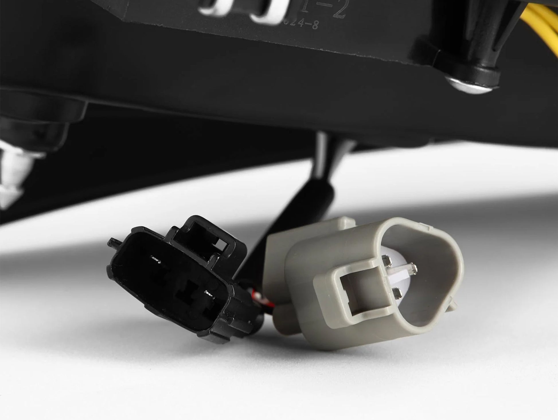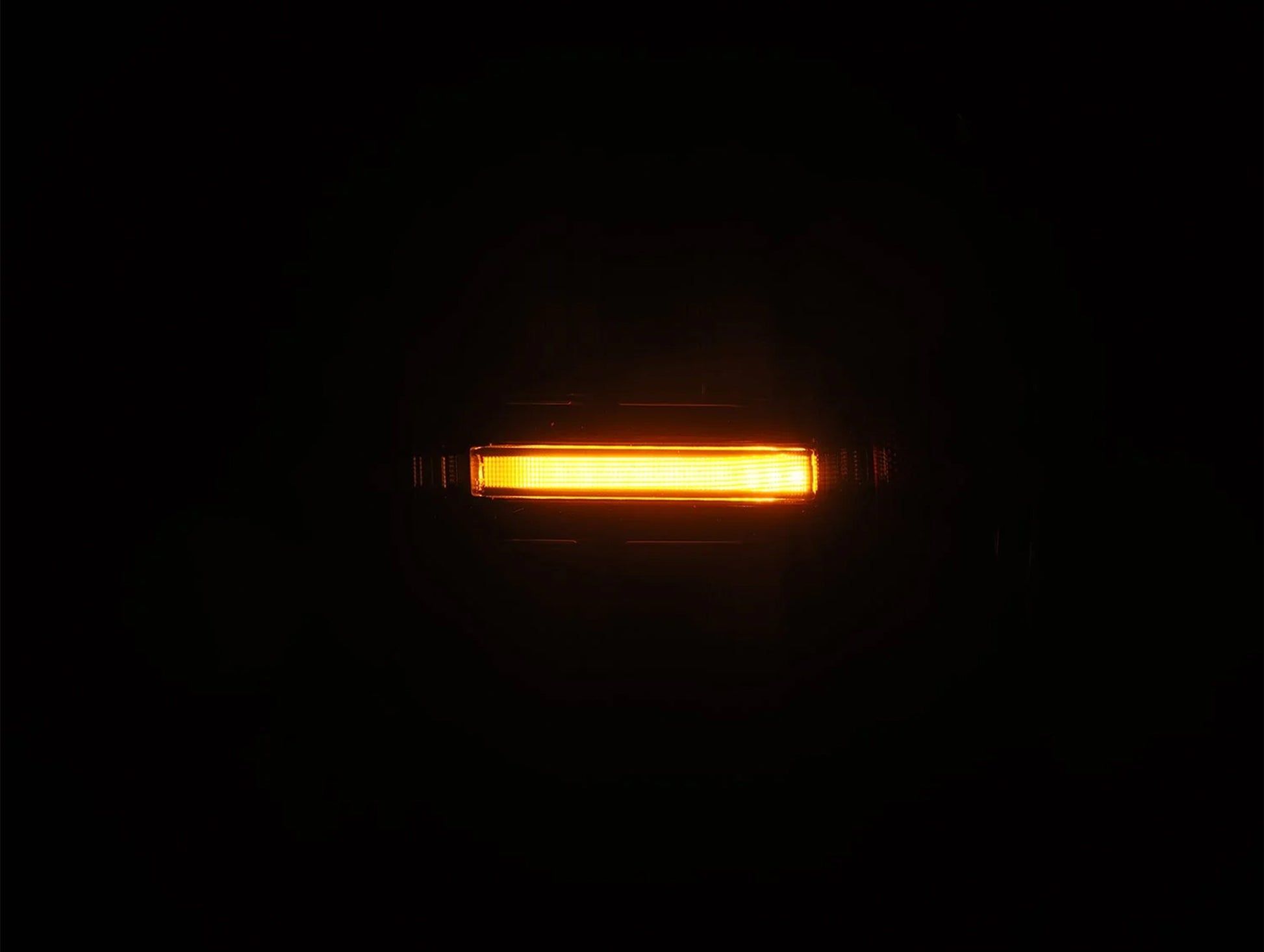 The trapezoidal prisms illuminate with red LEDs for parking lights, intensifying when braking. For turn signals, amber LEDs activate at the center bar between the prisms in a dynamic sequential flow, adding a modern touch. The bottom two LED prismatic tubes light up with white LEDs as a reverse indicator.