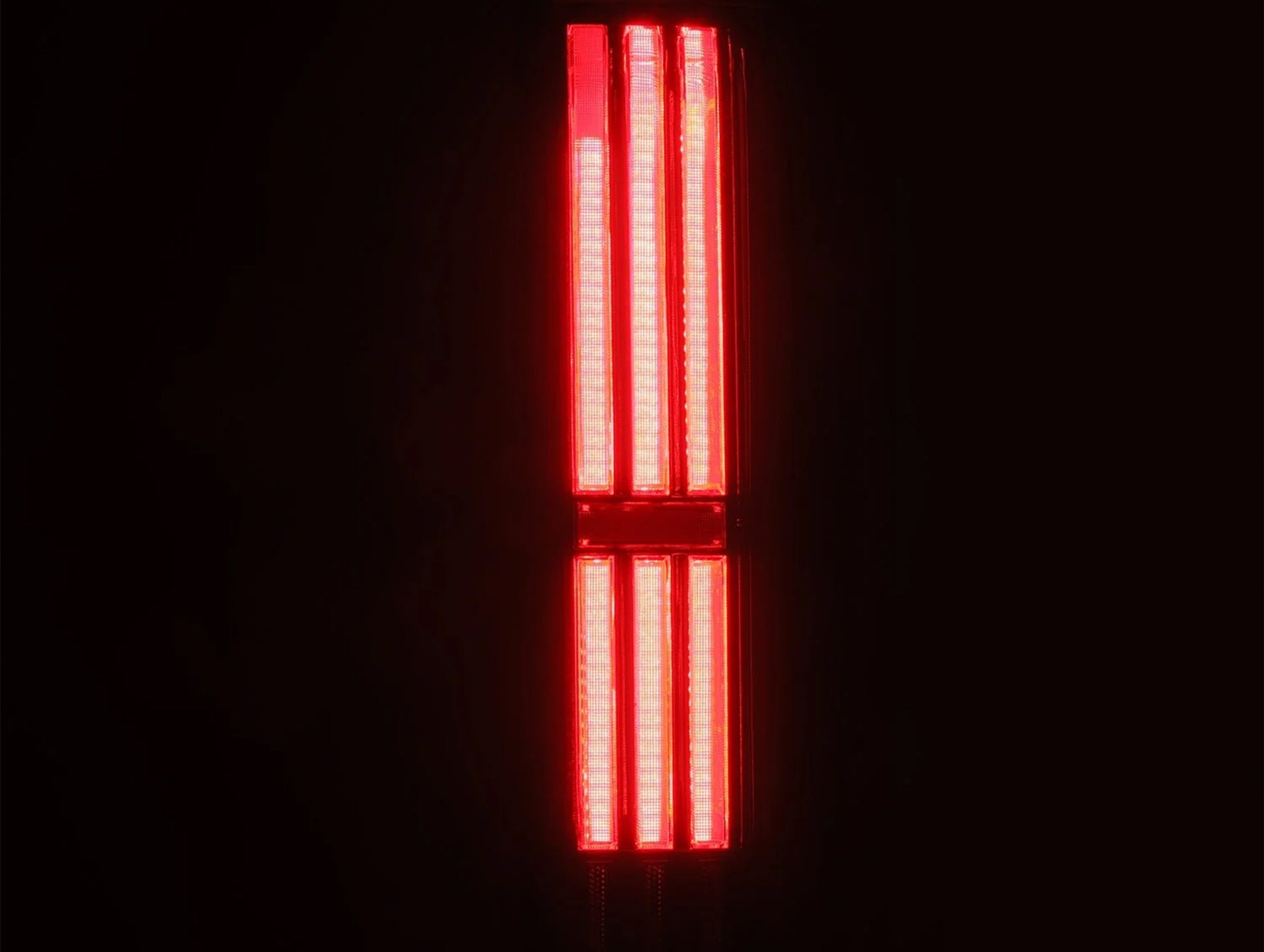 The six trapezoidal prisms use red LEDs for parking lights, intensifying when braking. For turn signal indications, amber LEDs are utilized across the prisms and central LED tube for a dynamic sequential signal. A side LED tube mirrors the stock design, providing additional parking light functionality.