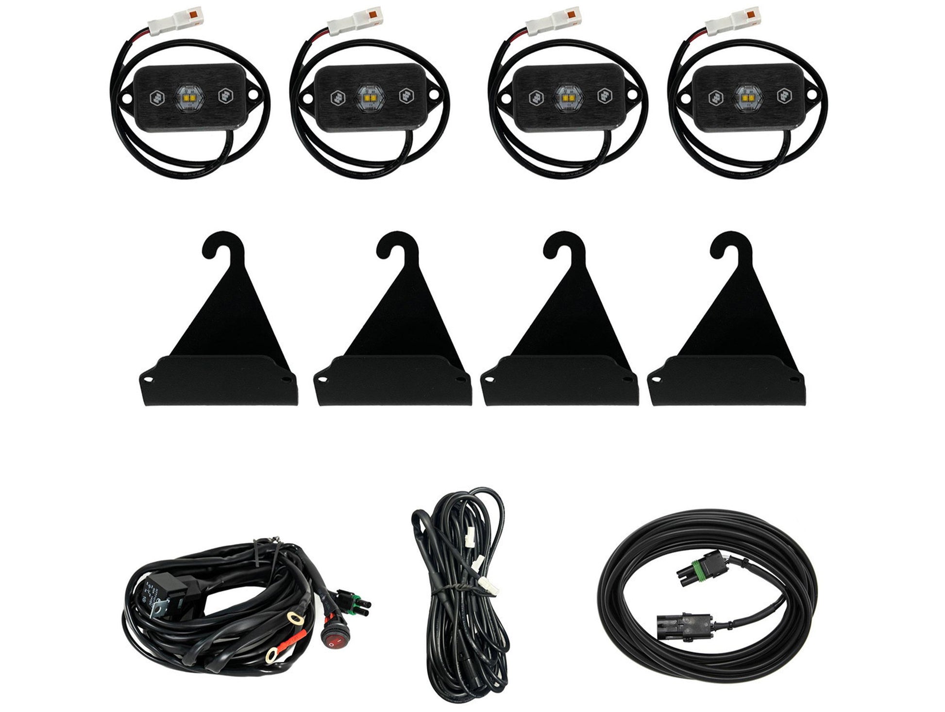 The Baja Designs bed rail cargo light kit for the 2005-2024 Toyota Tacoma and 2007-2024 Toyota Tundra models offer a significant upgrade to the lighting in the bed of your truck. This kit includes four small rock lights providing 400 lumens each that mount on hangers from the stock utility track mounting points. Wiring harness and all the necessary mounting hardware is included for a quick and easy installation.