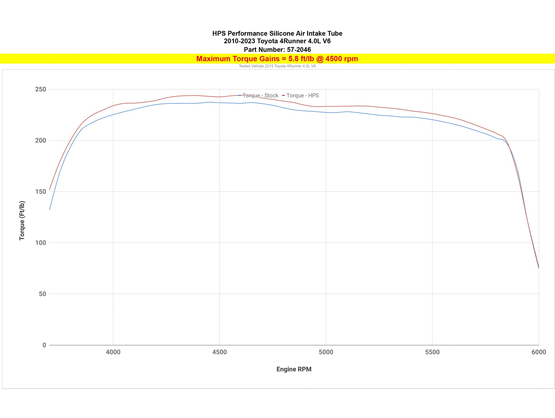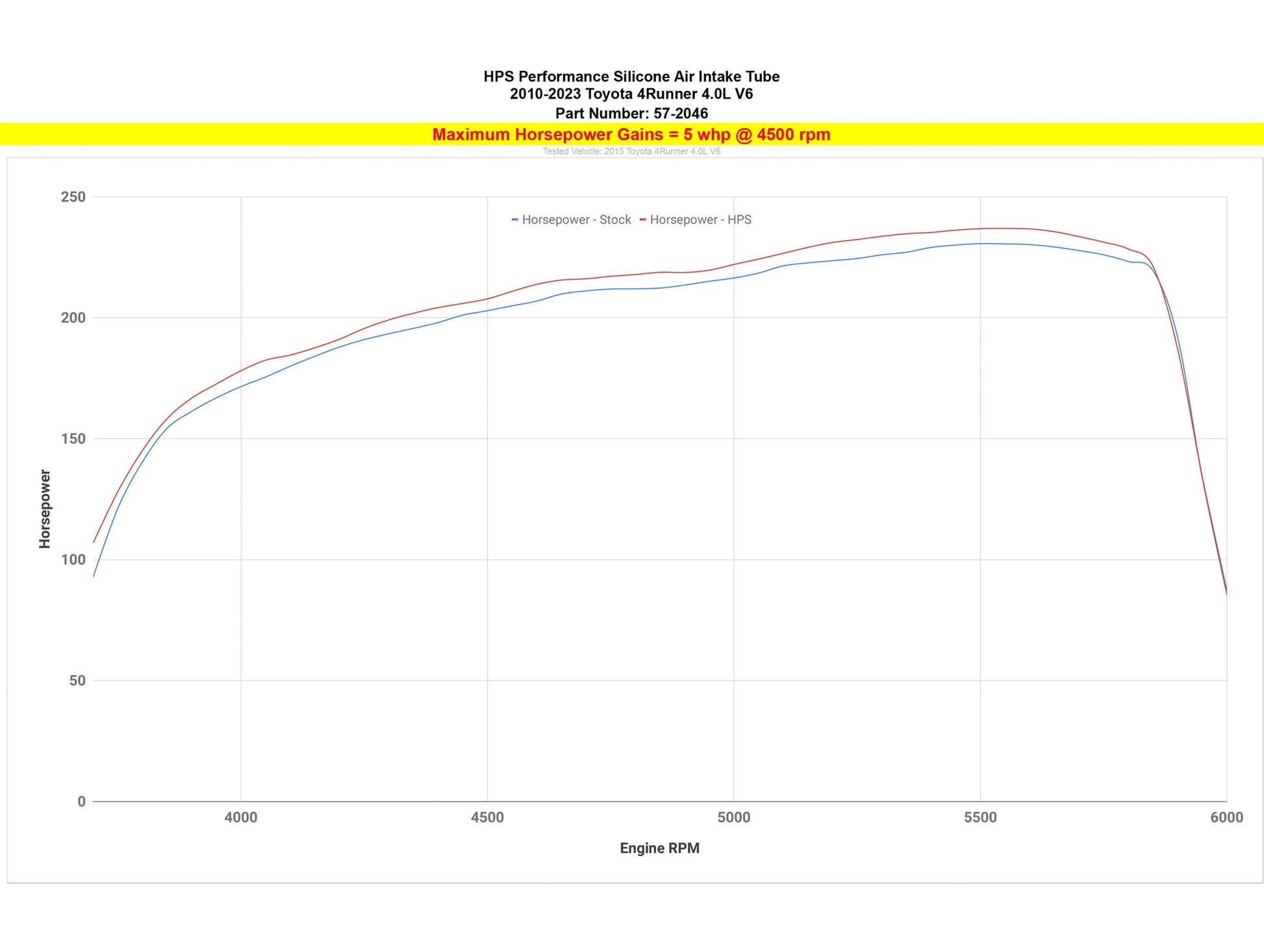 HPS high temperature reinforced silicone air intake hose kit (part number 57-2046) replaces 2010-2024 5th Gen Toyota 4Runner 4.0L V6 stock OEM rubber restrictive air intake hose with high-heat resistance material which meets or exceeds OE specifications (Maximum temperature rating: 350F). Without any re-tuning, the HPS silicone air intake kit improves overall performance and throttle response. HPS silicone intake kit also reduces heat soak while keeping the stock well designed air box perform at high efficient level. Tuning and modification are not required and it does not trigger CEL light.