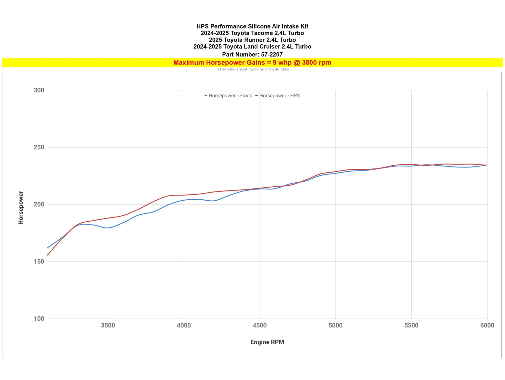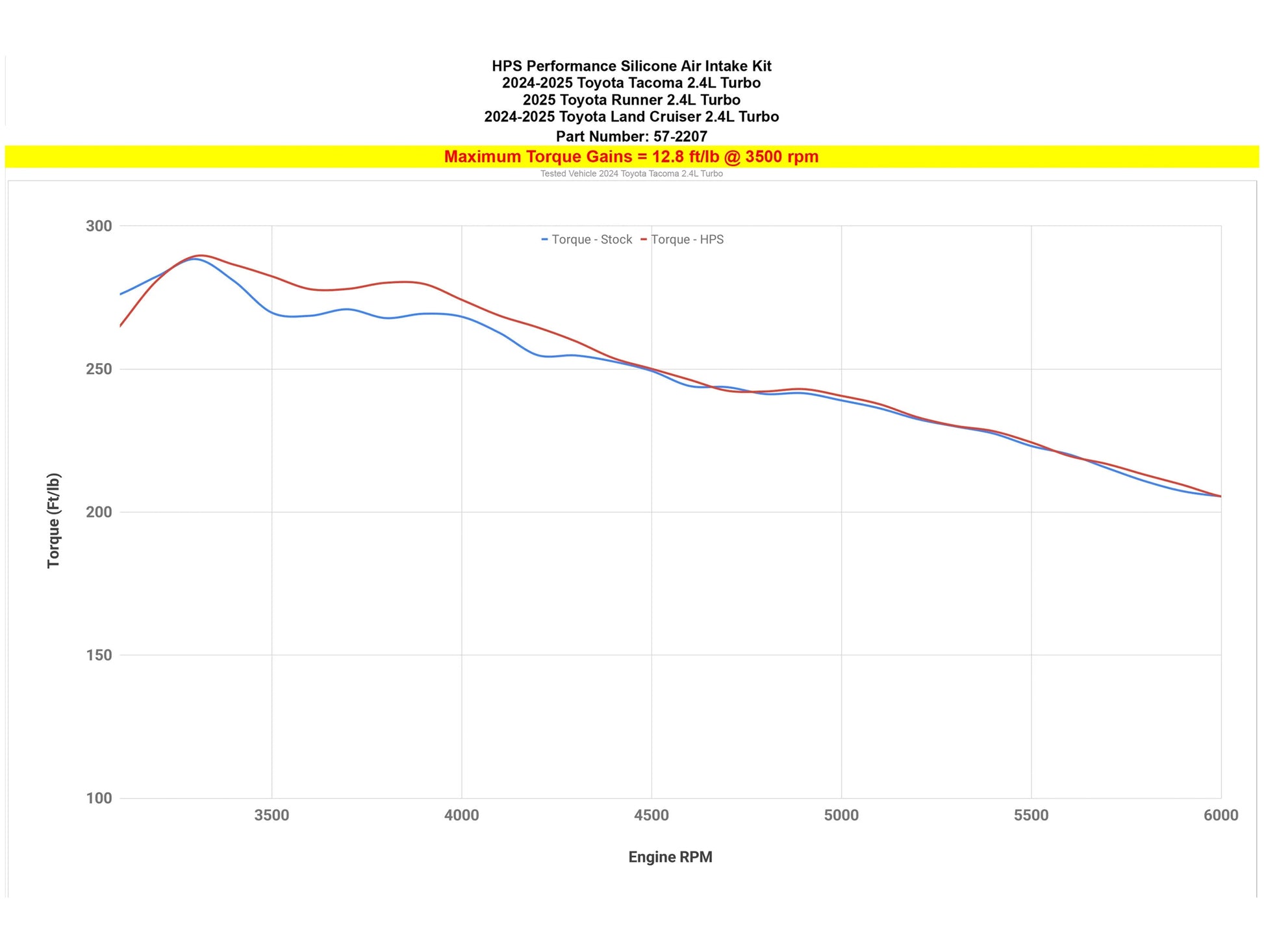 HPS Performance high temperature 4-ply reinforced silicone air intake hose kit (part number 57-2207) replaces 2024-2025 Toyota Land Cruiser 2.4L Turbo stock OEM rubber restrictive air intake hose with high-heat resistance material which meets or exceeds OE specifications (Maximum temperature rating: 350F). Without any re-tuning, the HPS silicone air intake kit delivers dyno proven performance gains - increase horsepower +9 whp , torque +12.8 ft/lbs and improves throttle response. HPS silicone intake kit also reduces heat soak while keeping the stock well designed air box perform at high efficient level. Tuning and modification are not required and it does not trigger CEL light.