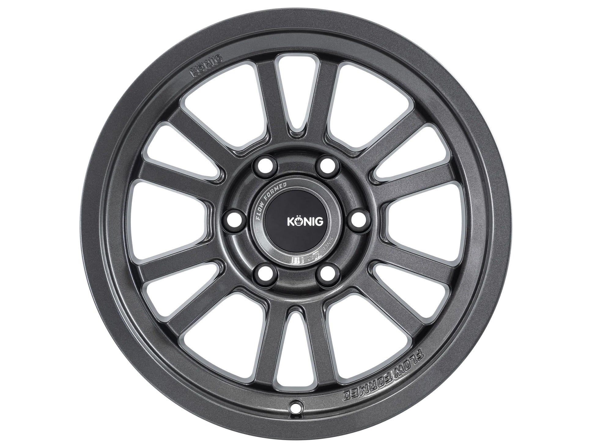 The HT1 is the first model of our new Hyper Trail Truck Series and styled with a 12-spoke flow formed design. The HyperTrail series brings all of the performance benefits that Konig Flow Formed wheels are known for in the motorsport world and offers applications for on and offroad Trucks, Jeeps and SUVs. Every HyperTrail wheel is constructed by utilizing FLOW FORMING TECHNOLOGY, is 2500 lbs load rated, comes with a increased thickness rear flange for extra rigidity, and has knurled bead seats to prevent tire slippage. The HT1 has a unique styled cap perch that allows the wheel to look finish if you choose to run the wheel without the center cap. The choice is yours, however, each wheel comes with the pictured flat, plastic pop-in center cap.