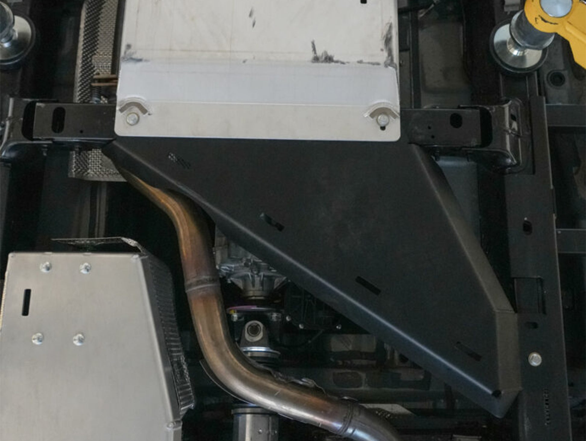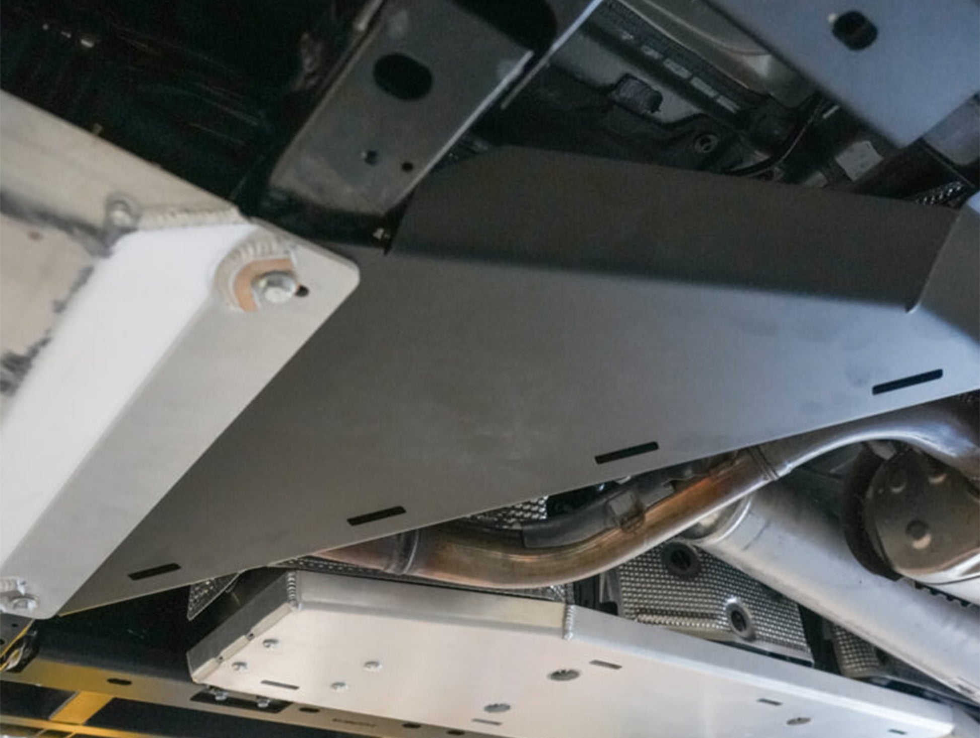 - Protects third cross-member, transfer-case, and exhaust pipe