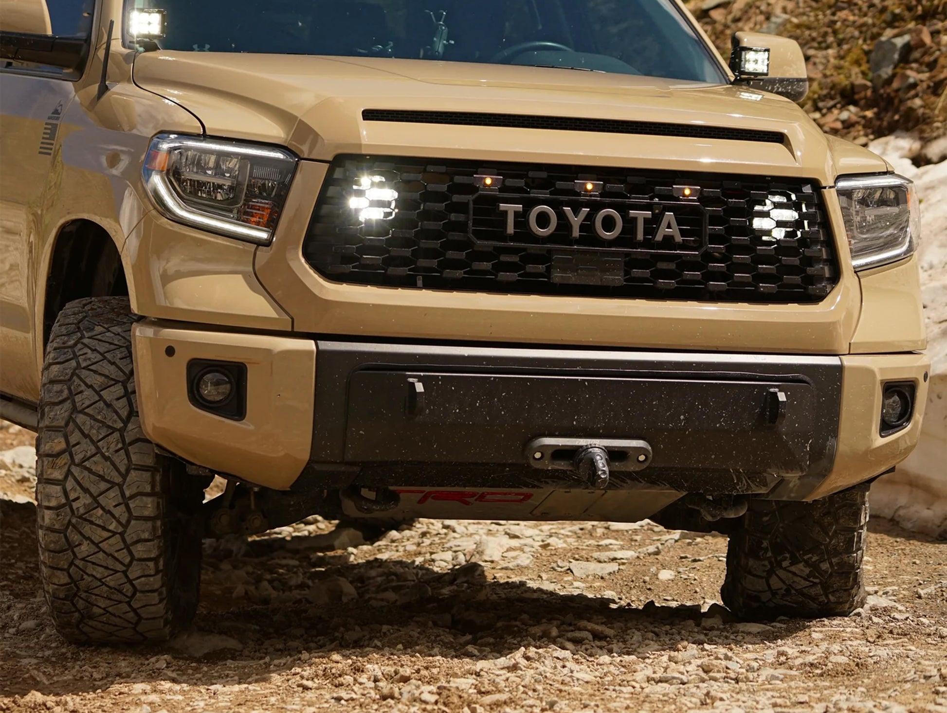 Lightweight and stout, the 2014-21 Toyota Tundra front bumper is the perfect fit for the weekend offroader or even the overlander looking to escape civilization. Constructed of 3/16″ steel, the winch mount plate can accept most 10,000-12,000 lb winches on the market today. Separate solenoid mounting may be required. Customize your bumper with a 30" lightbar cutout and a choice of a TSS Compatible Bullbar.