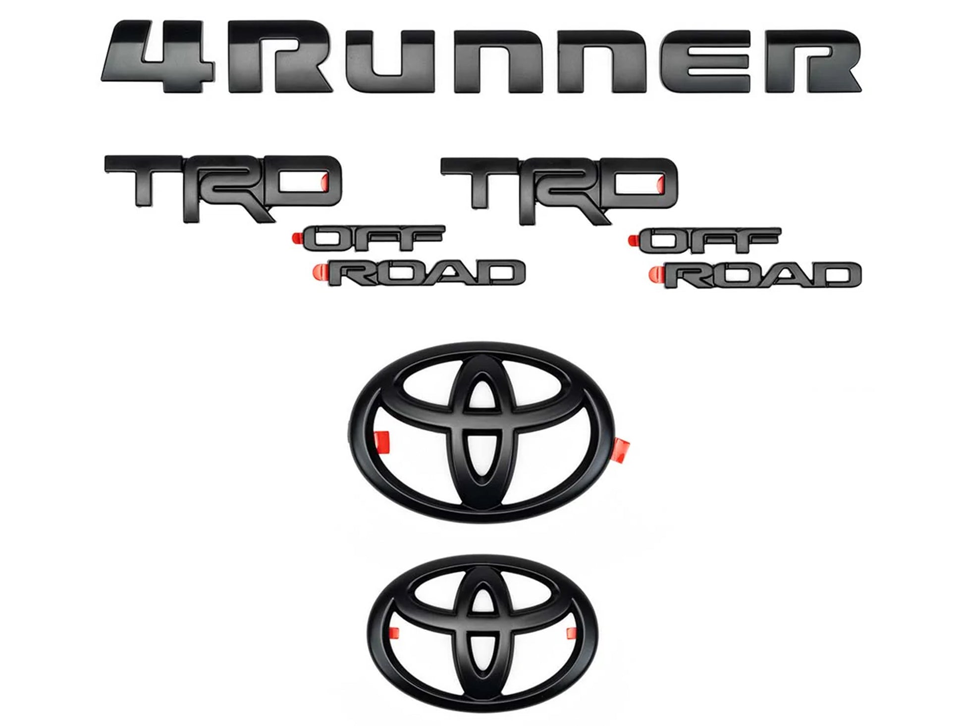 Black out your Toyota 4Runner with the OEM black emblem overlay kit. Ditch the outdated chrome badges and give your 4Runner a new and updated look. The OEM kit installs in just a few minutes, just clean your existing badges peel the tape, and stick them on. The perfect first mod for any 4Runner owner looking to give their vehicle a new look. Made from molded plastic with double-sided tape for easy installation and no worry about falling off.