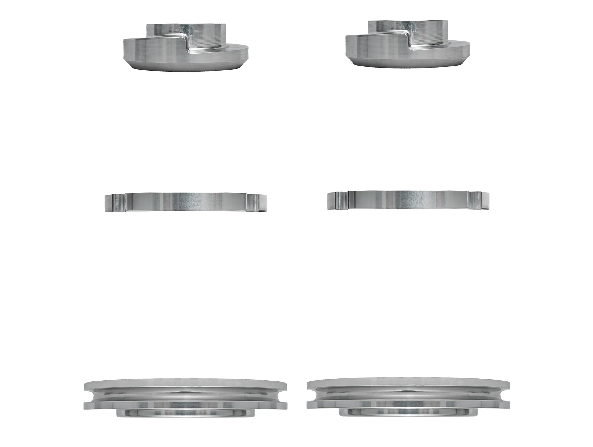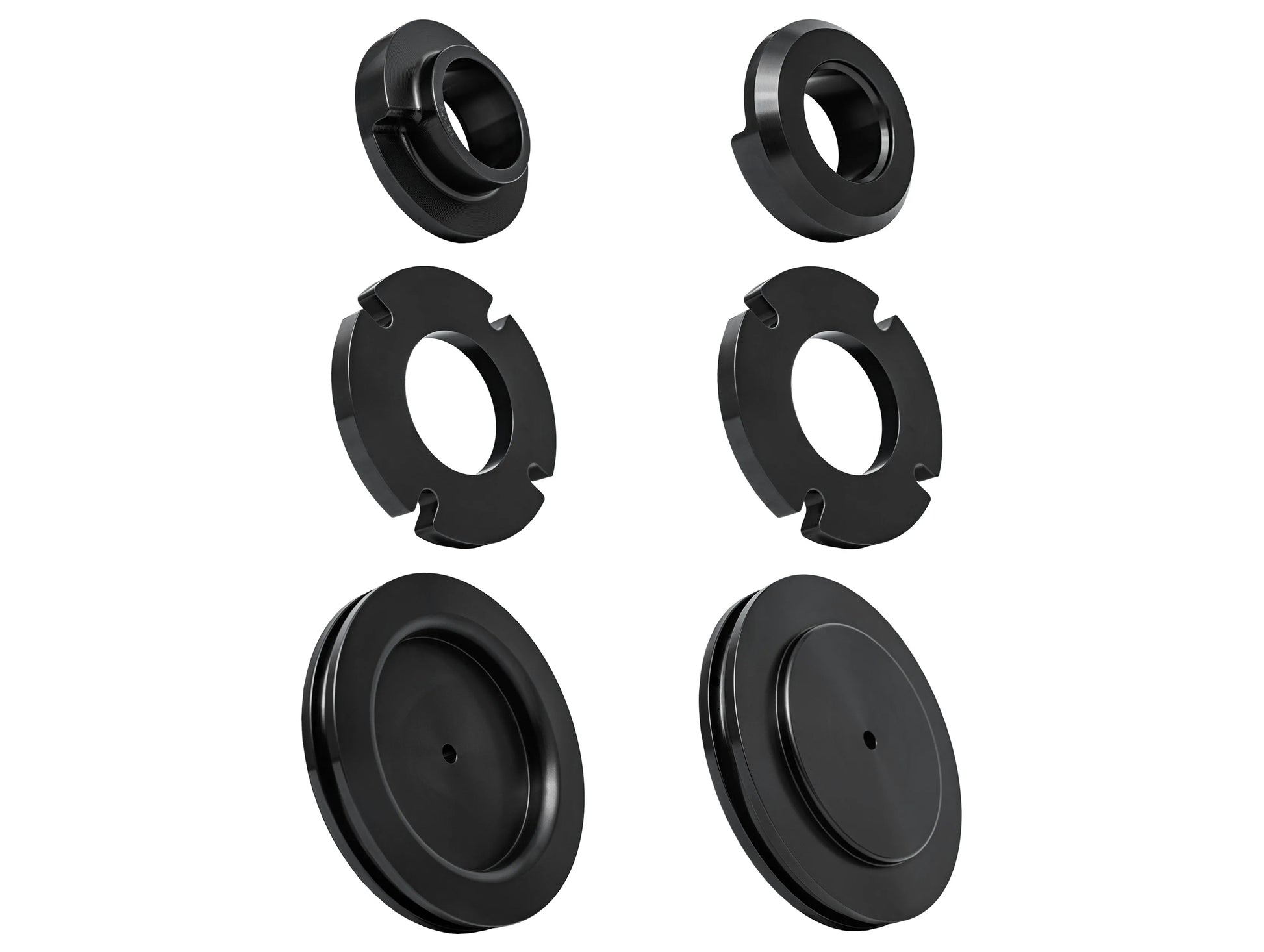 This kit features all new CNC machined components and are available in both raw aluminum and hard black anodized finishes for that true “like factory” look. This kit gives you 2.50” of lift in the front and .75” in the rear using your factory shocks and springs and includes complete hardware for an easy install. This is NOT your traditional spacer lift kit, you retain your factory ride quality, factory suspension geometry and still able to align the vehicle to factory specs after install. It does NOT require new UCA’s, and you can run up to a 35” tire with a 17×8.5+35 MM offset.